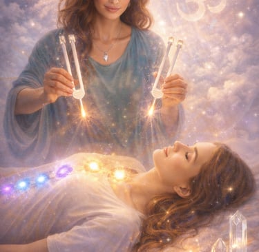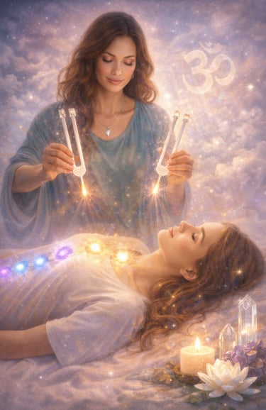 Sessions often include the OM tuning fork and Solfeggio scales, inviting the body to remember its innate rhythm of harmony and wholeness.